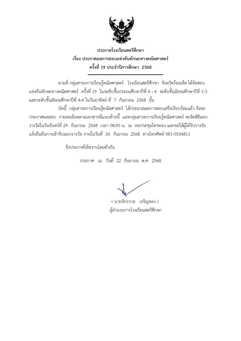 ประกาศรายชื่อผู้มีสิทธิ์สอบแข่งขันทักษะทางคณิตศาสตร์ ครั้งที่ 19 ปีการศึกษา 2568