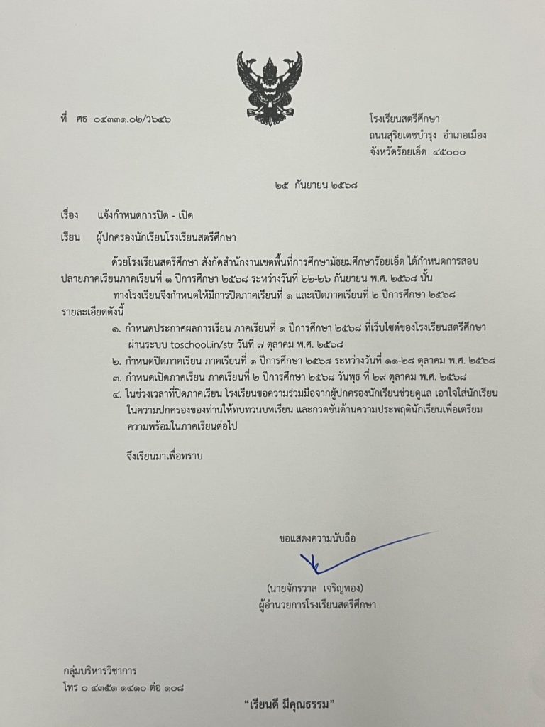 ประกาศปิดภาคเรียนที่ 1/2568