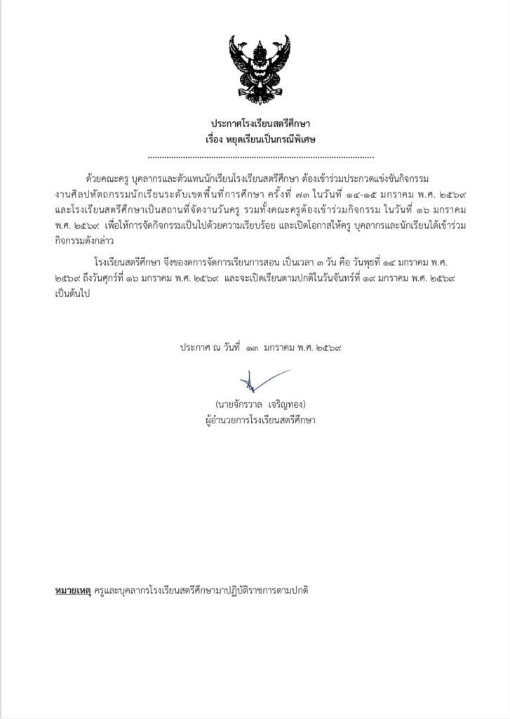 แจ้งหยุดเรียนเป็นกรณีพิเศษ 15/01/2569