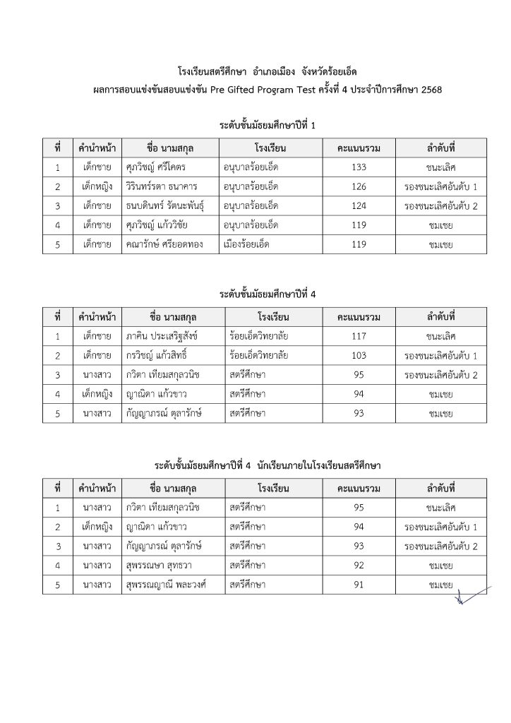 ประกาศผลสอบแข่งขัน Pre-Gifted Test ครั้งที่ 4 ปีการศึกษา 2568 ข่าวประชาสัมพันธ์ 26 ม.ค. 2026 2815 share tweet share ประกาศคะแนนสอบระดับชั้นมัธยมศึกษาปีที่ 1 ประกาศคะแนนสอบระดับชั้นมัธยมศึกษาปีที่ 4 tags: Pre-Gifted เรื่องที่เกี่ยวข้อง ข่าวเกี่ยวกับนักเรียน ประกาศผลสอบวัดความรู้ Pre-Gifted ครั้งที่ 2 โรงเรียนสตรีศึกษา ปีการศึกษา 2566 ข่าวเกี่ยวกับนักเรียน ประกาศรายชื่อผู้มีสิทธิ์สอบ Pre-Gifted ครั้งที่ 2 โรงเรียนสตรีศึกษา ปีการศึกษา 2566