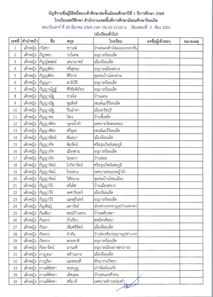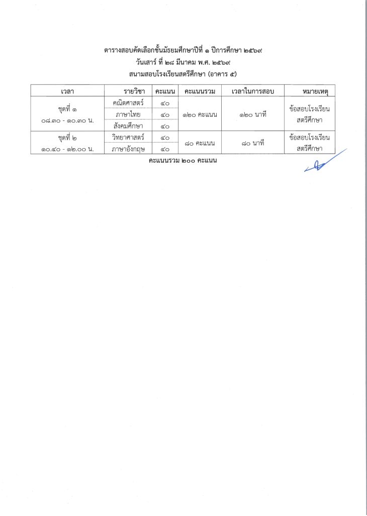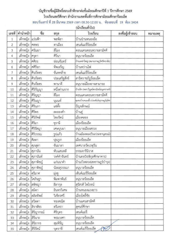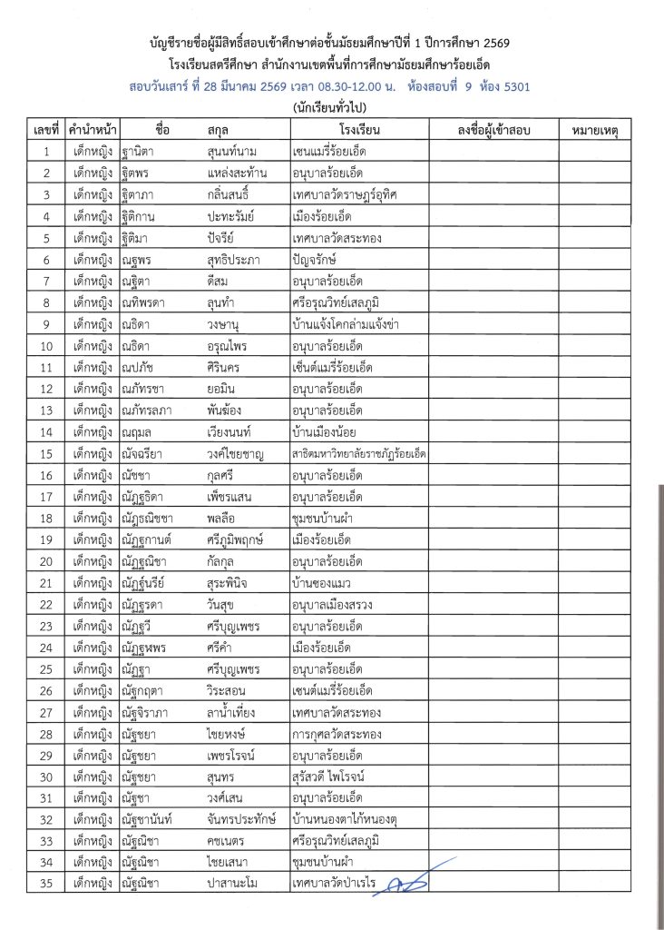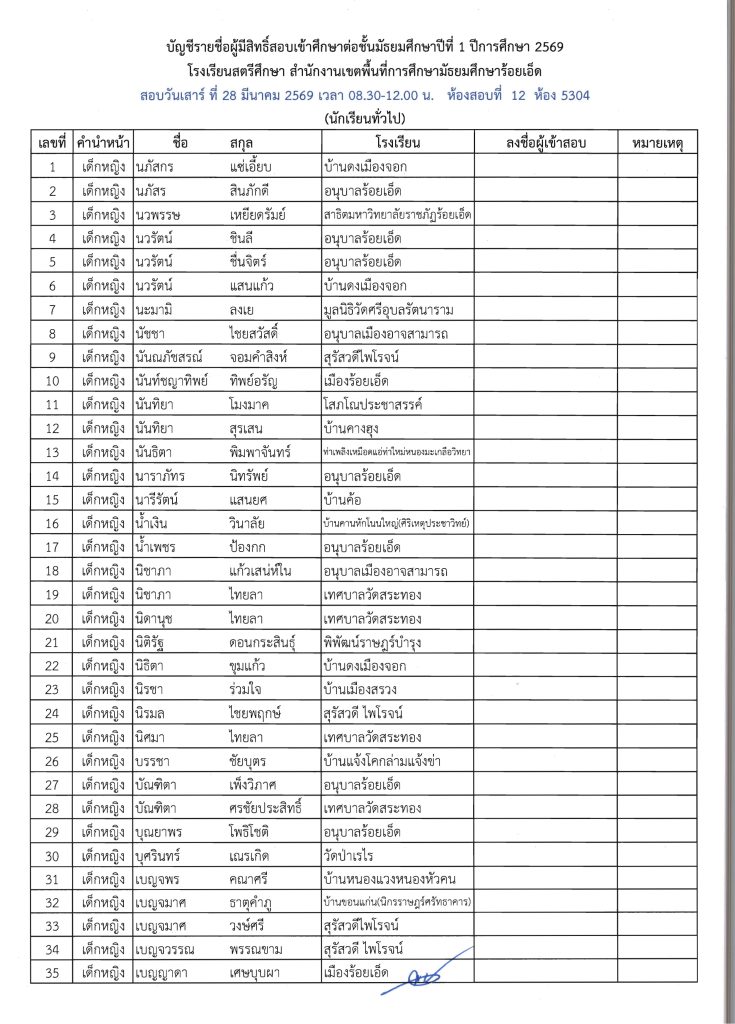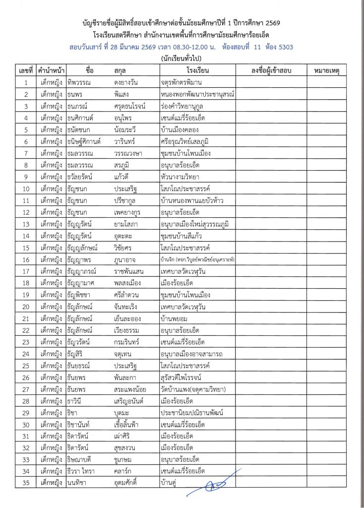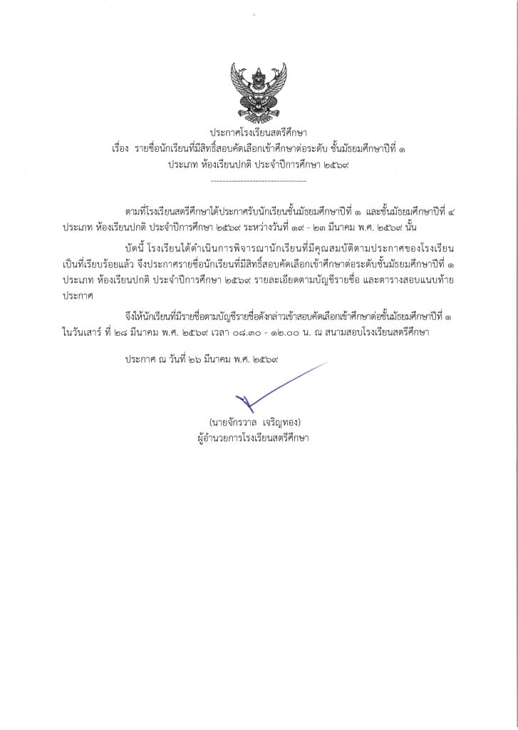 ประกาศรายชื่อผู้มีสิทธิ์สอบเข้าศึกษาต่อระดับชั้น ม.1 ห้องเรียนปกติ ปีการศึกษา 2569 ข่าวประชาสัมพันธ์ ข่าวเกี่ยวกับนักเรียน 26 มี.ค. 2026 140 share tweet share ไฟล์ประกาศรายชื่อผู้มีสิทธิ์สอบ ม.1 PDF | คลิกตรวจสอบรายชื่อห้องสอบ