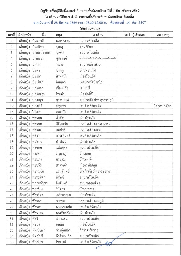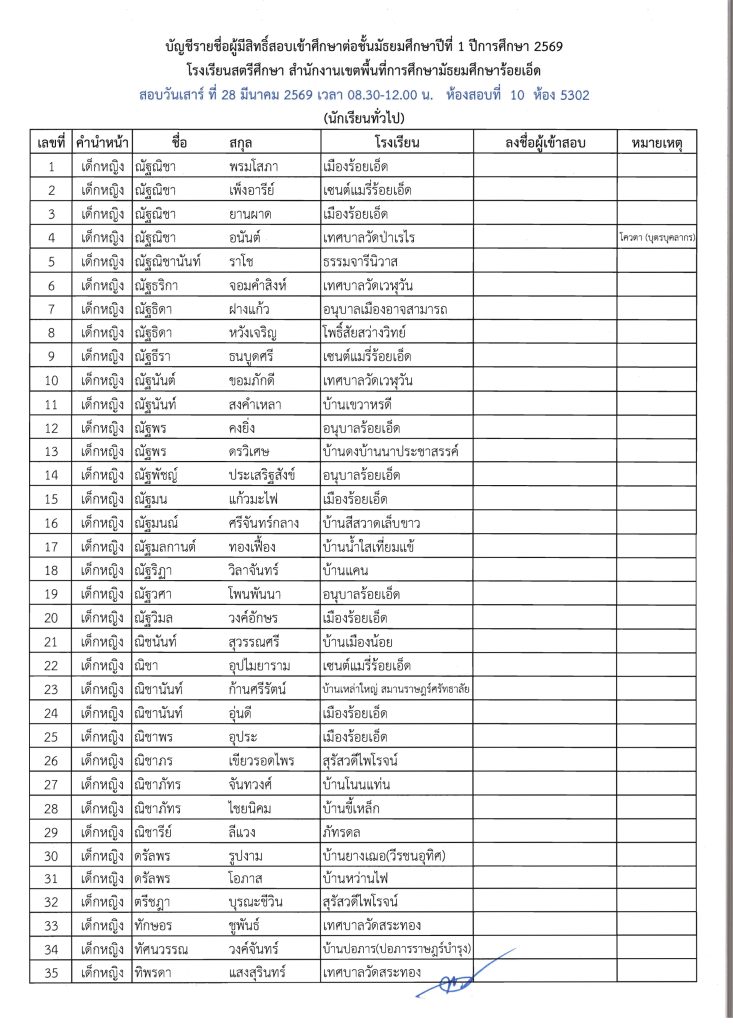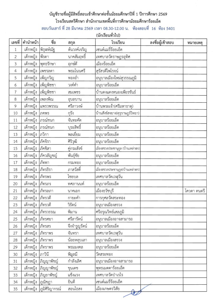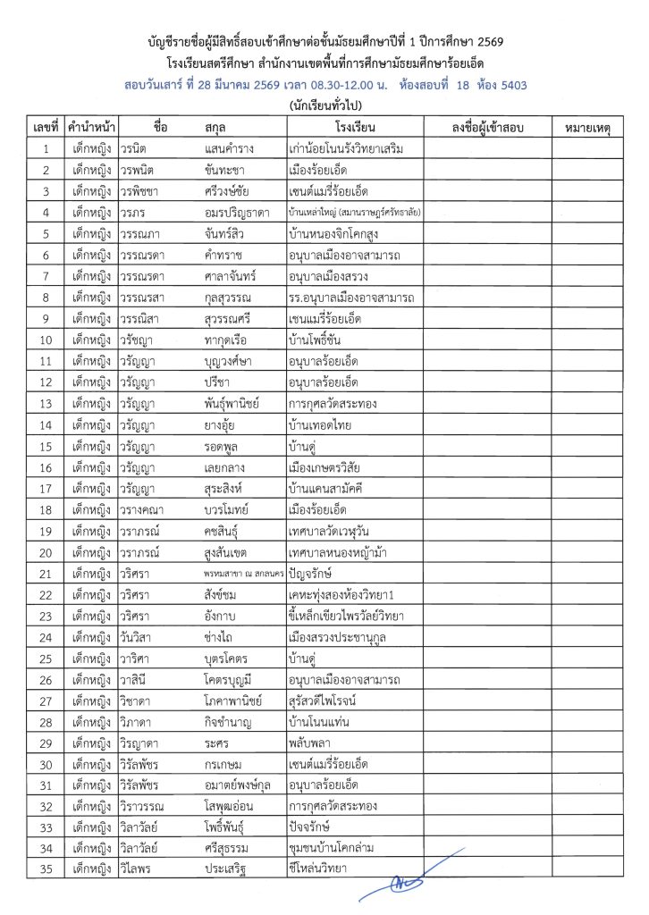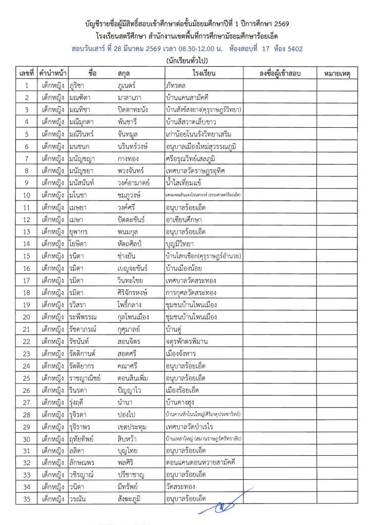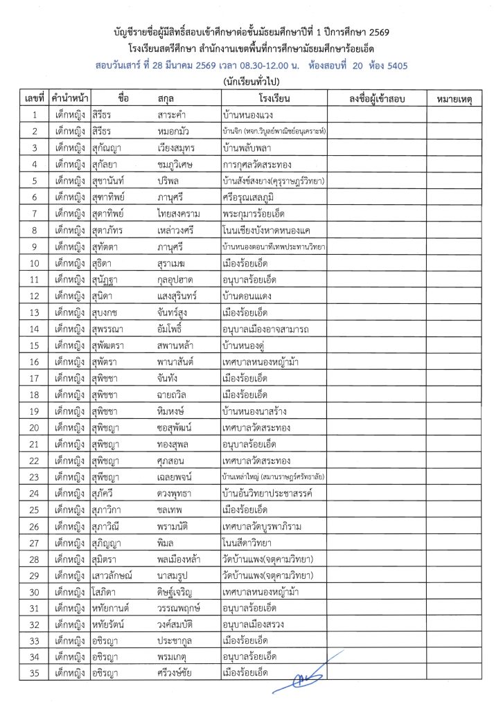 ประกาศรายชื่อผู้มีสิทธิ์สอบเข้าศึกษาต่อระดับชั้น ม.1 ห้องเรียนปกติ ปีการศึกษา 2569 ข่าวประชาสัมพันธ์ ข่าวเกี่ยวกับนักเรียน 26 มี.ค. 2026 140 share tweet share ไฟล์ประกาศรายชื่อผู้มีสิทธิ์สอบ ม.1 PDF | คลิกตรวจสอบรายชื่อห้องสอบ