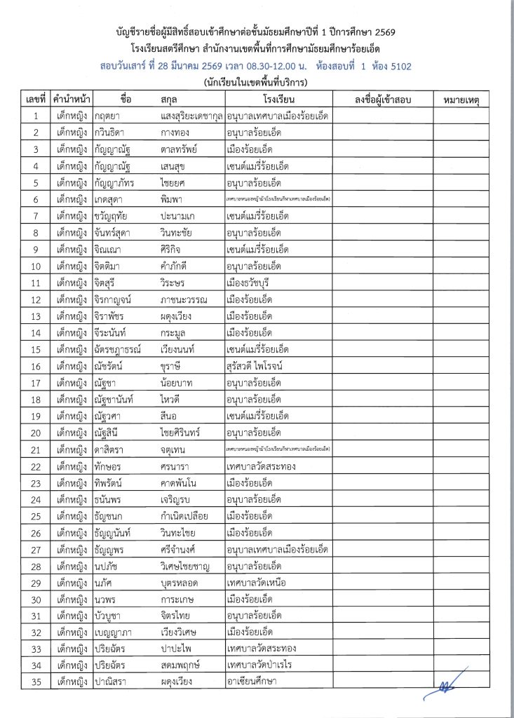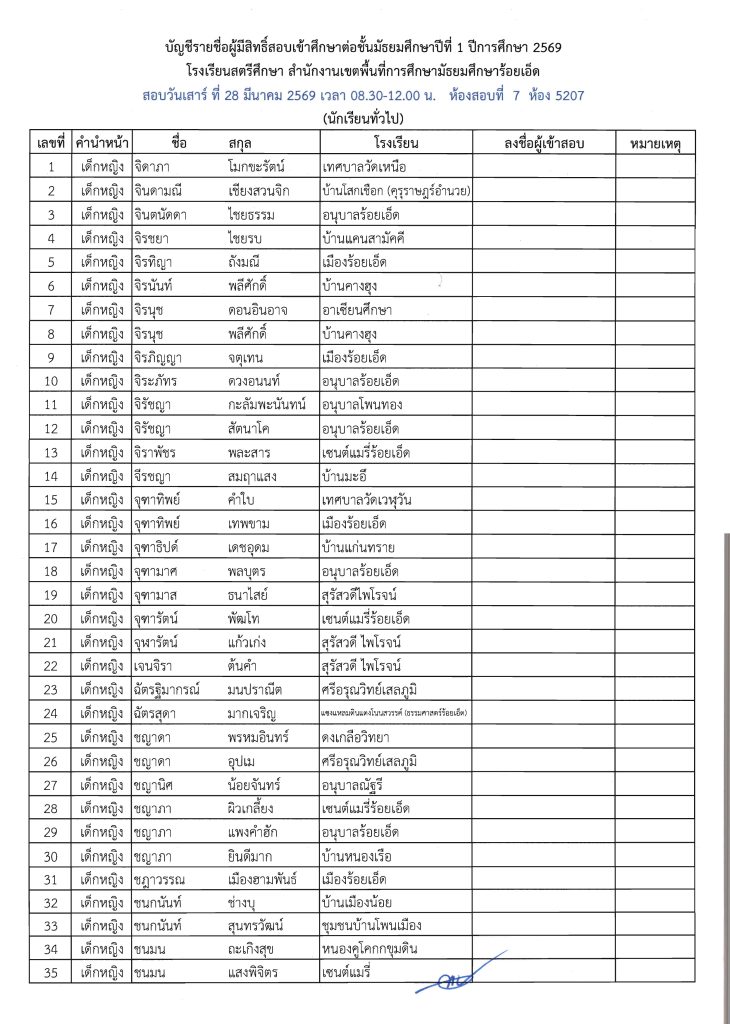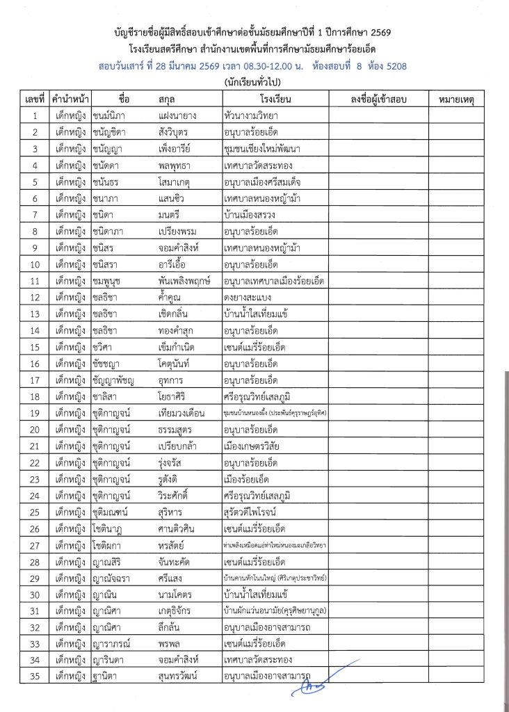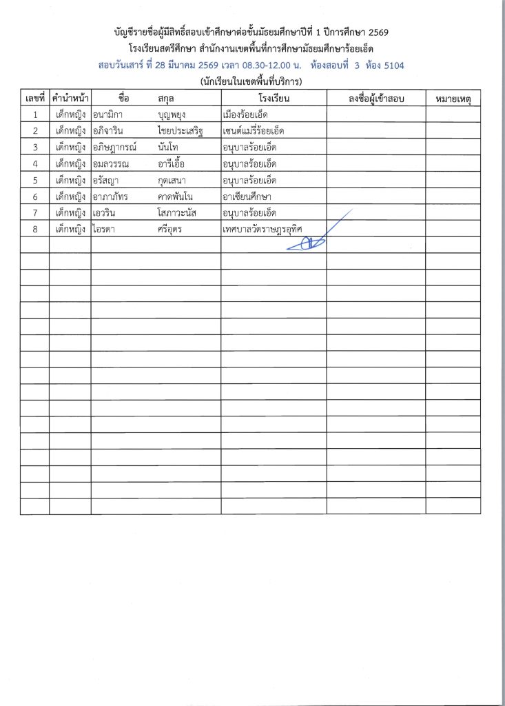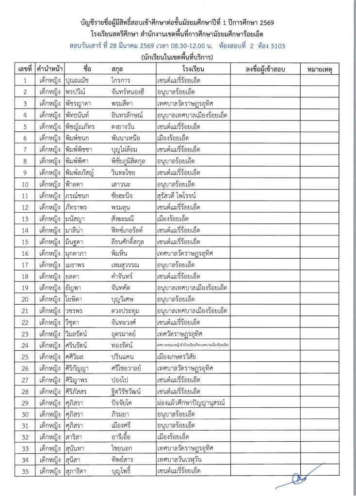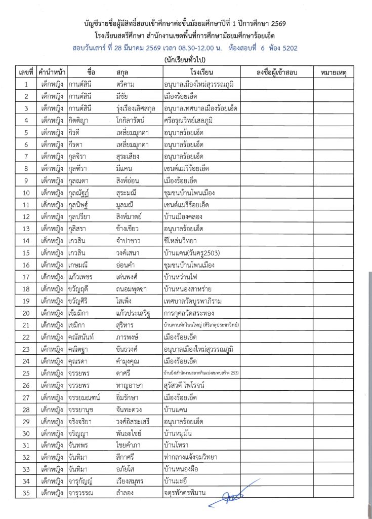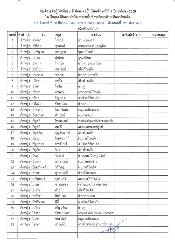 ประกาศรายชื่อผู้มีสิทธิ์สอบเข้าศึกษาต่อระดับชั้น ม.1 ห้องเรียนปกติ ปีการศึกษา 2569 ข่าวประชาสัมพันธ์ ข่าวเกี่ยวกับนักเรียน 26 มี.ค. 2026 140 share tweet share ไฟล์ประกาศรายชื่อผู้มีสิทธิ์สอบ ม.1 PDF | คลิกตรวจสอบรายชื่อห้องสอบ
